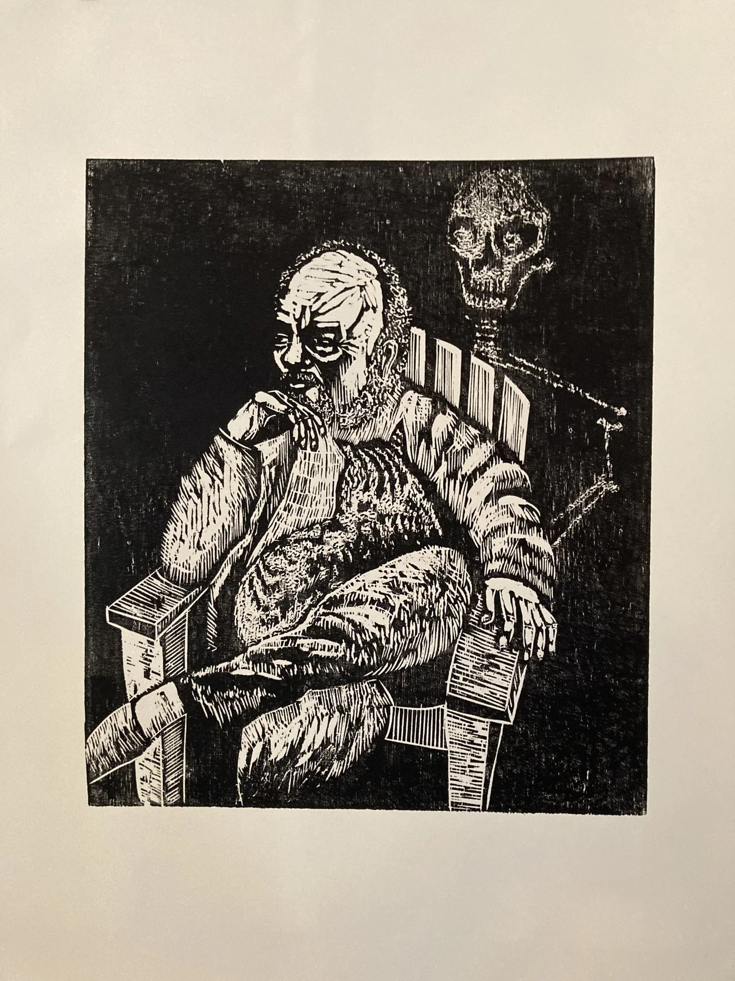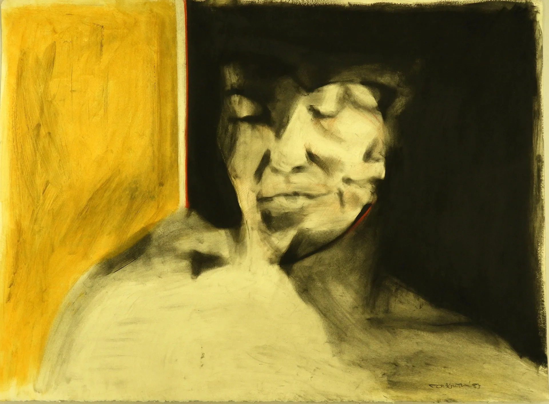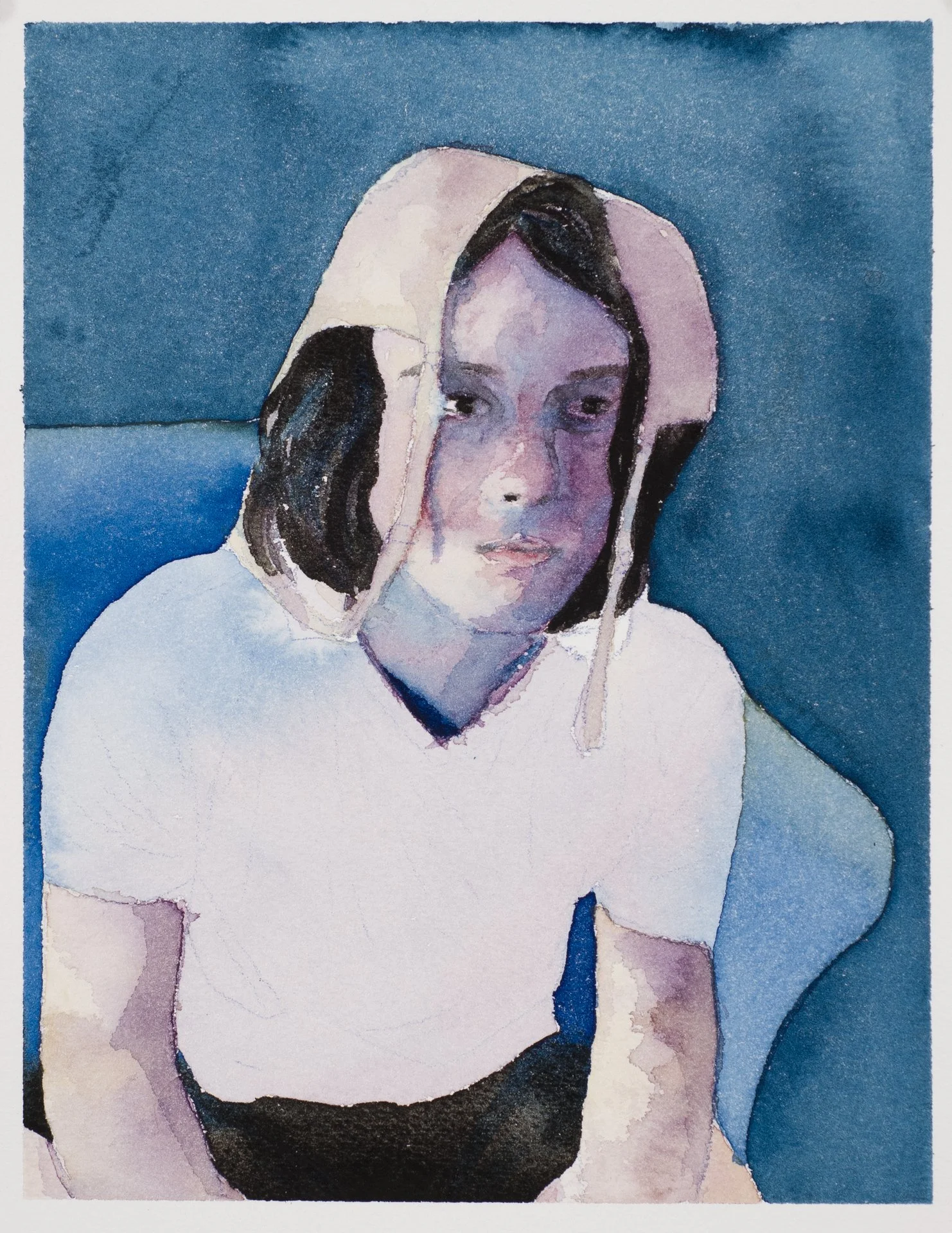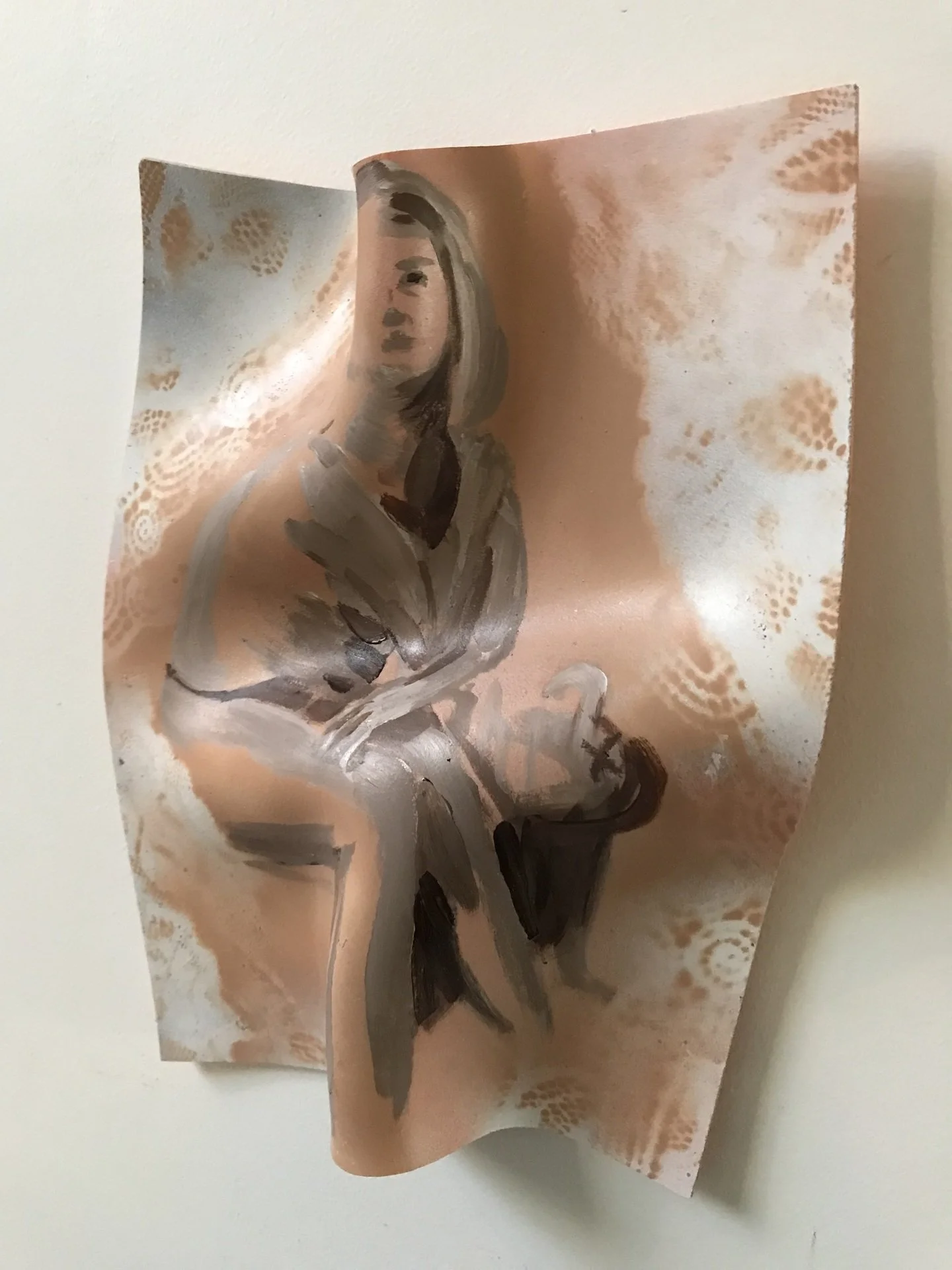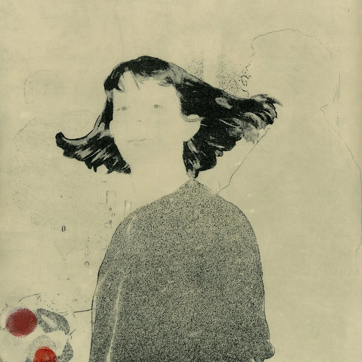 Many artists in the exhibition employ materials that demonstrate their subject’s mood. The sense of internal self-reflection witnessed by the viewer in these works is reinforced not only through a wistful expression but in the medium that renders it. BETH FEIN utilizes the delicate chine collé technique to create exquisite prints. The hazy afterimage from the printing process conjures wistful, distant memories or fleeting moments. By contrast, LAWRENCE HUGHES’s starkly graphic woodblock prints draw his figures further into their own states of impenetrable contemplation. MELINDA CLYNE’s undulating self-portraits, painted on Plexiglass, literally have the artist folded in on herself.