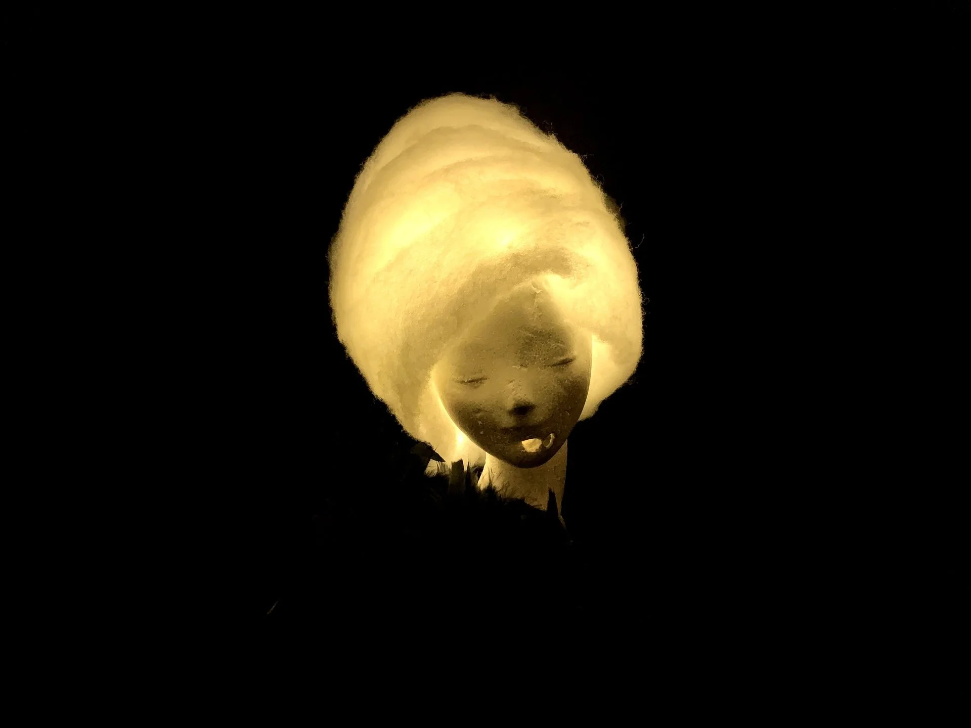 Mixed fiber, metallic thread, beads, acrylic paint and air dry clay