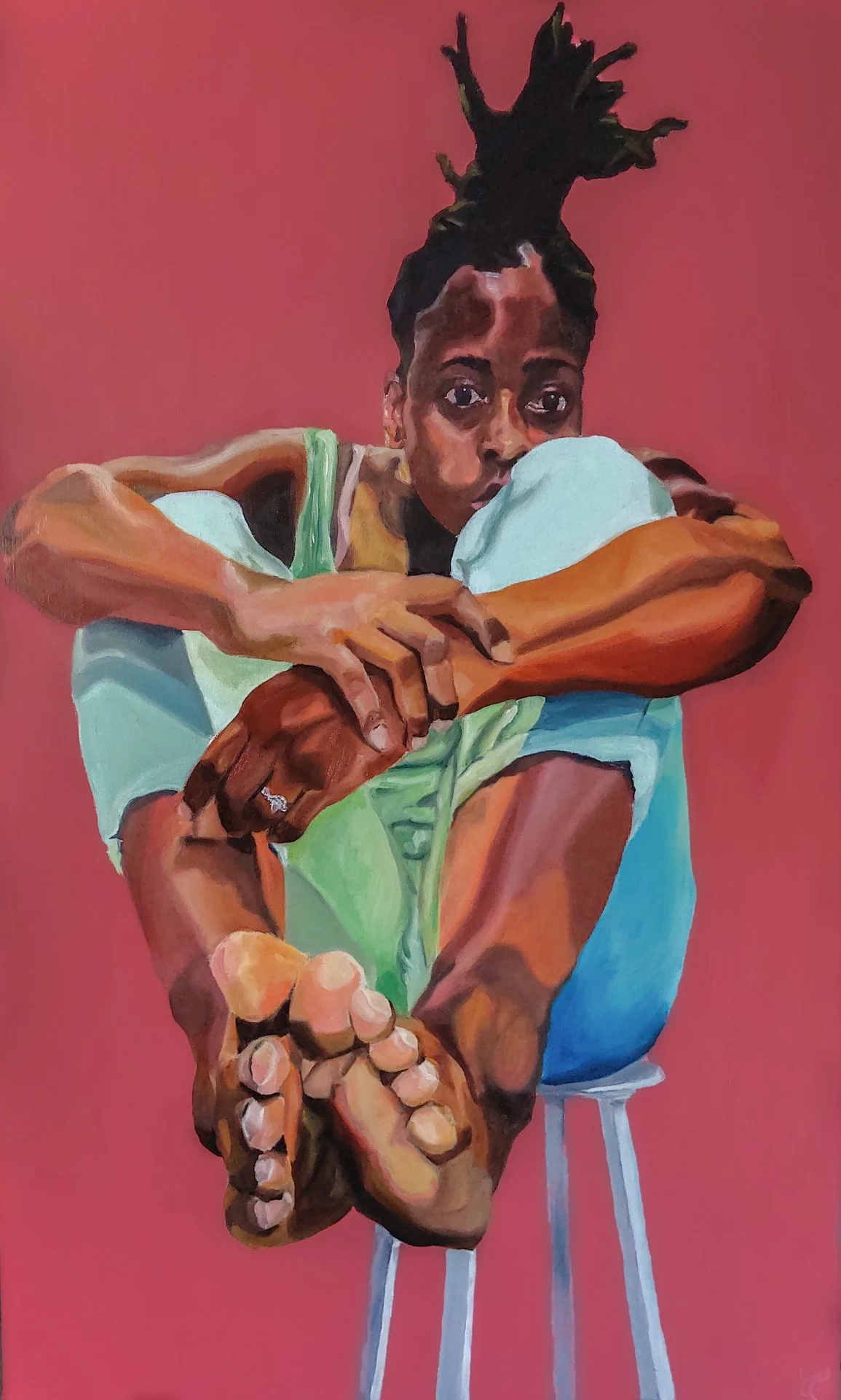 These figures’ eyes penetrate beyond the frame, beyond the limns of our conscious to other dimensions. Though indirect, JOAN RYAN’s piercing charcoal portrait, titled Truth, is a startlingly uncomplicated statement on the power of the gaze, realized in the simplest terms: dark charcoal and white erasures, the frame closely cropped around the subject’s braided head. An otherworldly atmosphere permeates WIN MA’s glowing Aura, a poised sense of self radiating through the digital print, and KIEREN JEANE’s witchy, Surrealist painting, Can You Feel The Devotion? In her tactile, hand-held mixed-media sculpture, RUTH IRVING expands her spirit in a metaphysical self-portrait as a comet with fluffy-tufted bits. JUSTICE HENDERSON’s self-portrait shows only her beautifully elongated feet. Casting heavy shadows, they are poised to step out beyond the painting. SEMAJ CAMPBELL’s classically-inspired heroine directs her gaze at the viewer, yet the photograph insists on a grander sense of the future by looking back at and reimagining the past.