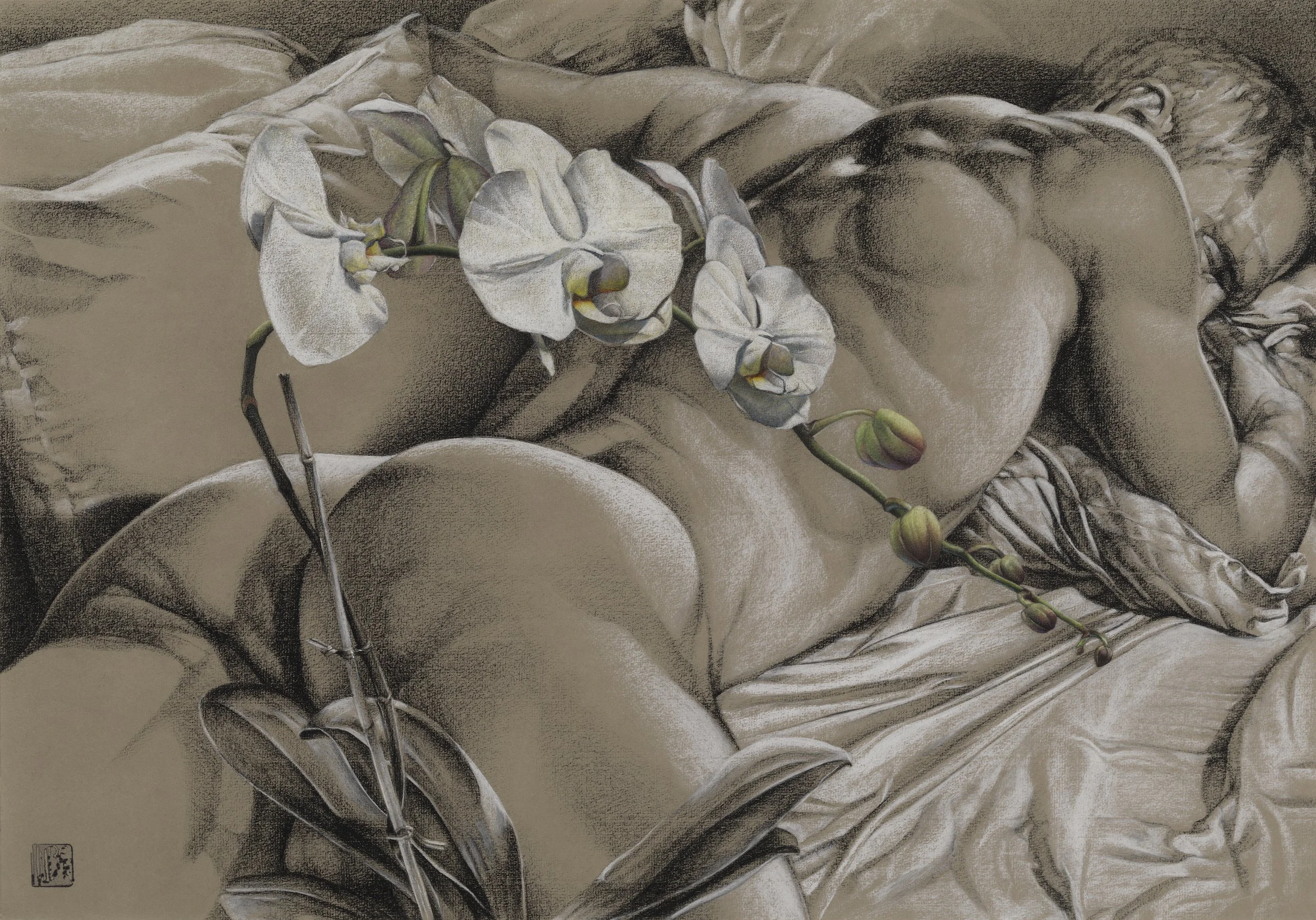 Voyeurism is perhaps the most basic entry point into portraiture, an intimate experience of looking in on a private scene that has been revealingly exposed. Rotund heads bow together, whispering secrets, in SOOJIN CHOI’s ceramic pairs. Although their words are silenced, the figures draw us into their personal dramas with expressive features etched into their broad clay forms. SAXON BAIRD’s blink-or-you’ll-miss-it photograph, Hold It, captures an unbearably private moment even as it touches on the universal. Erotic and theatrical, GERARD HUBER celebrates the male body in his detailed conté drawings. Huber winks to voyeuristic tendencies in art history with Homage to Boucher, subverting the Rococo painter’s provocative female nude with a tender depiction of a naked man from a lover’s perspective. CHRISTOPHER SMITH unabashedly objectifies with Diana Bags a Stag, allowing us to revel in the female figure’s sexual conquest with an admiring view of her partner’s backside, exposed through a contrastingly elegant shallow stone relief.