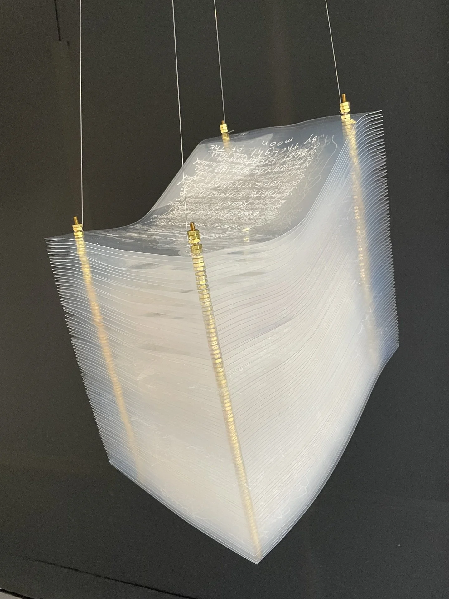 In Yukio Ito’s cosmic print, vibrant, luminous ribbons swirl to form the abstracted word ‘oasis,’ and Tom Gehrig also invokes the sky with depictions of constellations, where mythology was literally written in the stars. Paige Bradley’s sculpture of a supine female, arm outstretched to cradle an orb is lit from within, illuminating the word ‘breathe’ etched on her breast. Naomi Grossman’s sculptures are made from wires shaped into female figures, bound together literally and figuratively by the familiar promises of wedding vows. Kristina Estell uses high-visibility neon fabric cut to form the German word Sympatisch, meaning friendly and agreeable, is suspended from the ceiling like a visual exclamation mark.